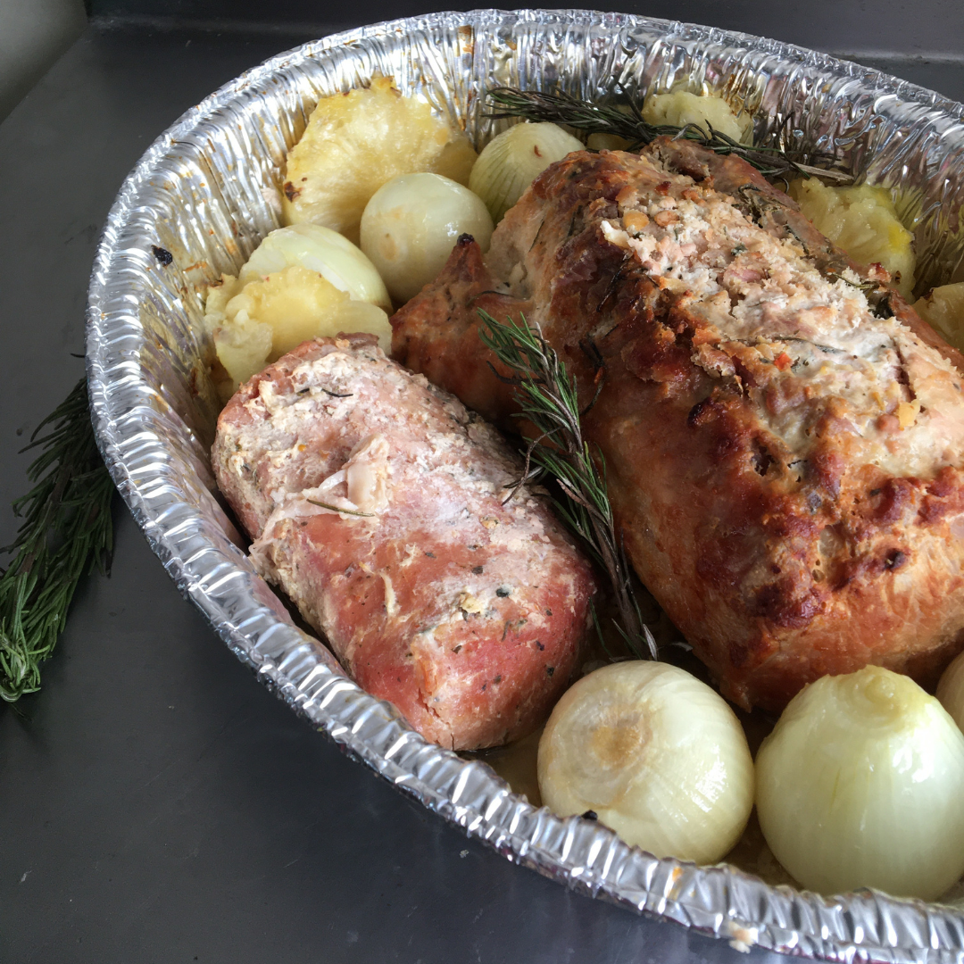 Lombo inteiro ao molho de abacaxi, com cebolas caramelizadas. Produto assado, entregue pronto para consumo.